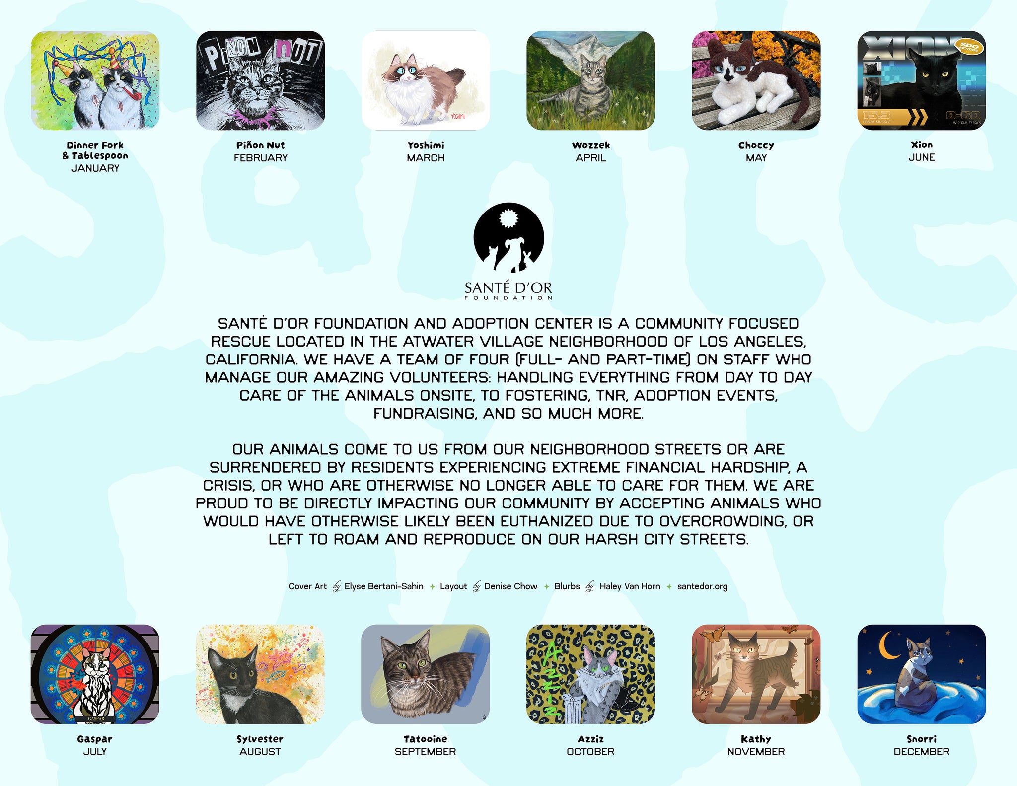 Our new Santé D'Or 2026 Calendar! Featuring lovingly rendered portraits of some of our resident cats created by our wonderful volunteers, fosters, and adopters. Features exclusive artwork not currently available anywhere else!